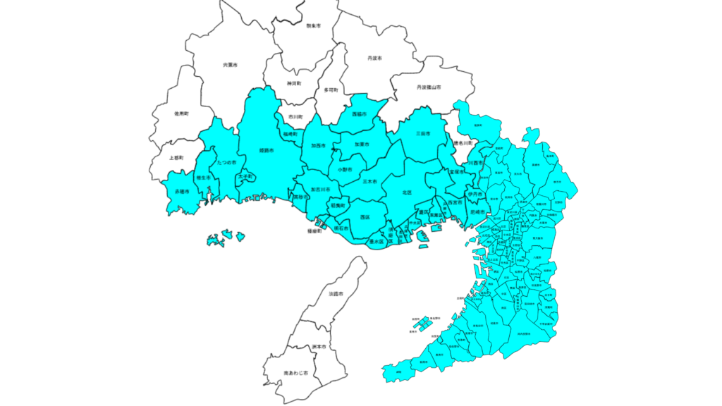 芦屋市・西宮市・宝塚市・尼崎市・伊丹市・川西市・神戸市・三田市・三木市、姫路市、大阪府全域